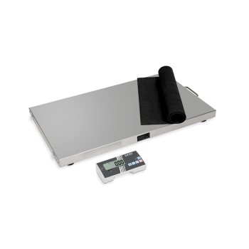 Trådløs platformsvægt KERN EOS-A med trådløs radioforbindelse mellem vejeplatform og display, hvilket eliminerer risikoen for beskadigede kabler. Vægten understøtter tre radiokanaler, så flere platforme kan tilsluttes samme display. Den store vejeplatform gør vægten ideel til vejning af store pakker eller som veterinærvægt. Vægten er udstyret med både håndtag og hjul, hvilket gør den nem at transportere og opbevare. Den indbyggede dyrevejningsfunktion (HOLD) gør det muligt at fastlåse en stabil gennemsnitsværdi, selv når dyret er i bevægelse. En skridsikker gummimåtte medfølger og gør vægten særligt velegnet til vejning af dyr.